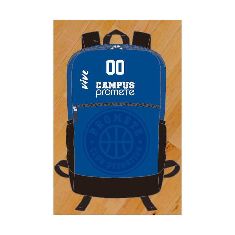 Mochila con dos compartimentos frontales con cremallera y dos bolsillos laterales.